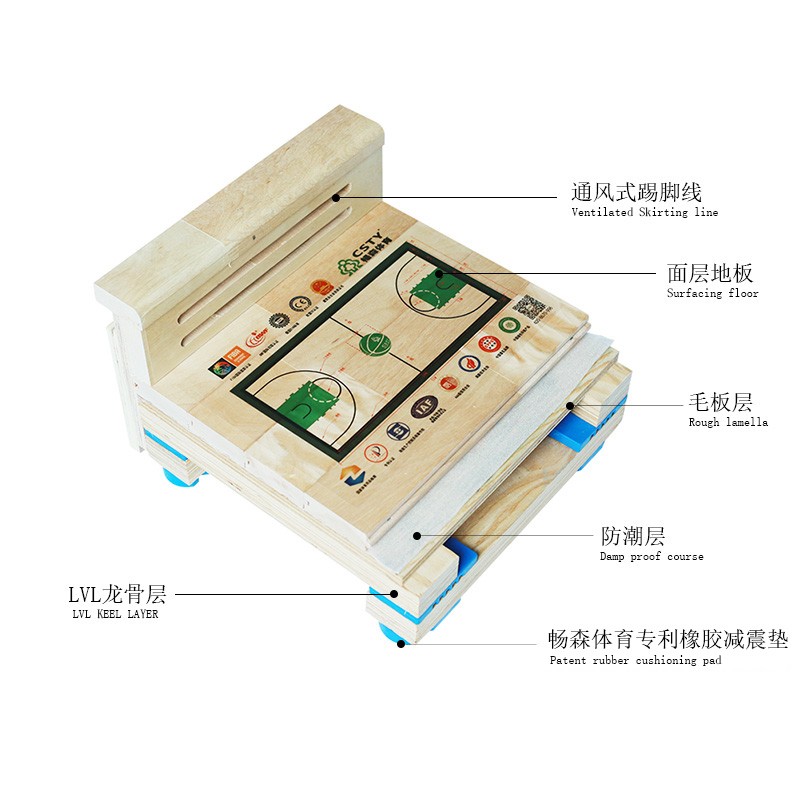 这是一种全纵向层叠式抗变形悬浮式结构,它不但坚固耐用而且弹性十足, LVL龙骨经过高温高压处理,在每层单板之间有环保胶封闭,能长期起到防腐作用,且大大提高了木龙骨的弹性、韧性,抗弯性能。运动性能完全满足DIN标准的要求。