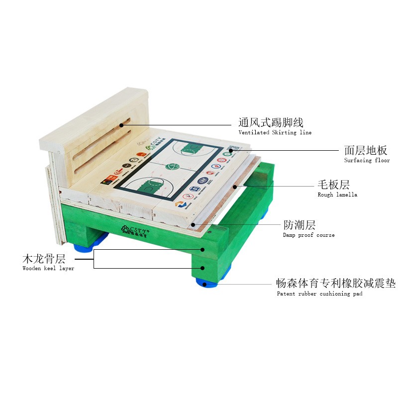 双层龙骨结构在毛地板与弹性垫之间增加了一层龙骨,运动木地板标高增加,加大了毛地板与地面之间的距离,使运动木地板底层结构通风性及防潮功能好。在上下龙骨的交点之间加一个弹性垫,既保证系统结构的的高稳定性,避免龙骨直接接触容易产生响声,又能保证龙骨间垂直相互运动,提供充足的弹性,提高运动性能。